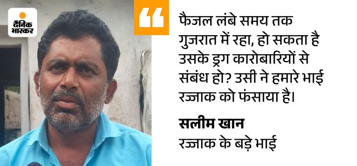 परिवार को भी शक- फैजल ने फंसाया रज्जाक के परिवार को शक है कि फैजल ने ही उसे फंसाया है। बड़े भाई सलीम कहते हैं कि रज्जाक सीधा-सादा है। वो अपने काम से काम रखने वाला लड़का है। हमें तो पूरा यकीन है कि उसे फैजल ने ही फंसाया है। वो तो टावर की मशीनों के ठेका लेने का काम करता था। इस लाइन( ड्रग्स) का आदमी नहीं था, न ही उसे इस बारे में कुछ पता था।