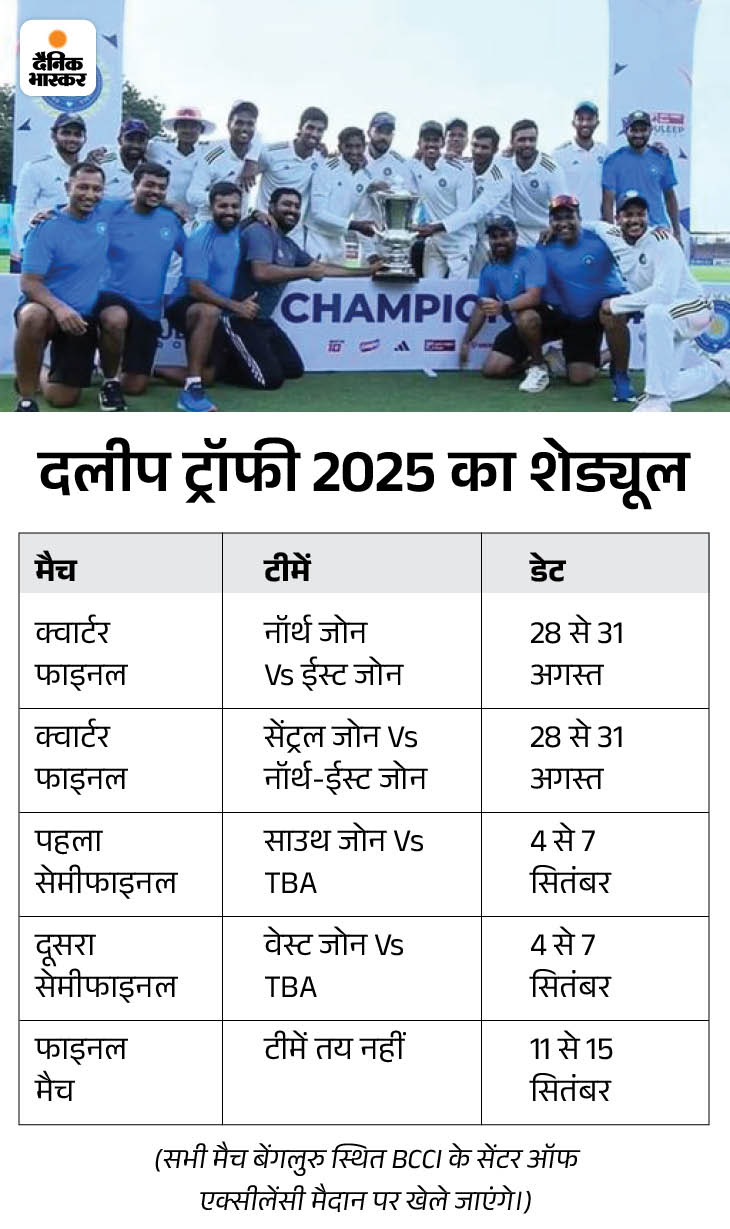 साउथ जोन की टीम ने 2023 में दलीप ट्रॉफी का खिताब जीता था। उसने वेस्ट जोन को 75 रन से हराया था। इस कारण साउथ जोन की टीम मौजूदा सीजन में सीधे सेमीफाइनल मैच खेलेगी। यह मैच 4 से 7 सितंबर के बीच खेला जाएगा। इसी दौरान वेस्ट जोन दूसरे सेमीफाइनल में हिस्सा लेगी।