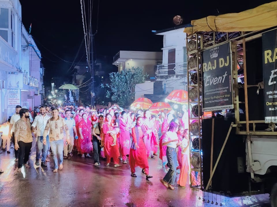 शोभायात्रा में ज्योति सिर पर रखकर चलती महिलाएं।