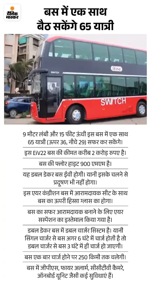 यह डबल डेकर बस स्विच मोबिलिटी कंपनी का मॉडल EiV22 है, जिसकी कीमत करीब 2 करोड़ रुपए है। बस को पूरी तरह चार्ज होने में 1.5 से 3 घंटे का समय लगेगा। यह लग्जरी बस आधुनिक सुविधाओं से लैस है और यात्रियों को आरामदायक यात्रा का अनुभव देगी। शुरुआत में इसे शहर के दर्शनीय स्थलों की सैर के लिए चलाने की योजना है।