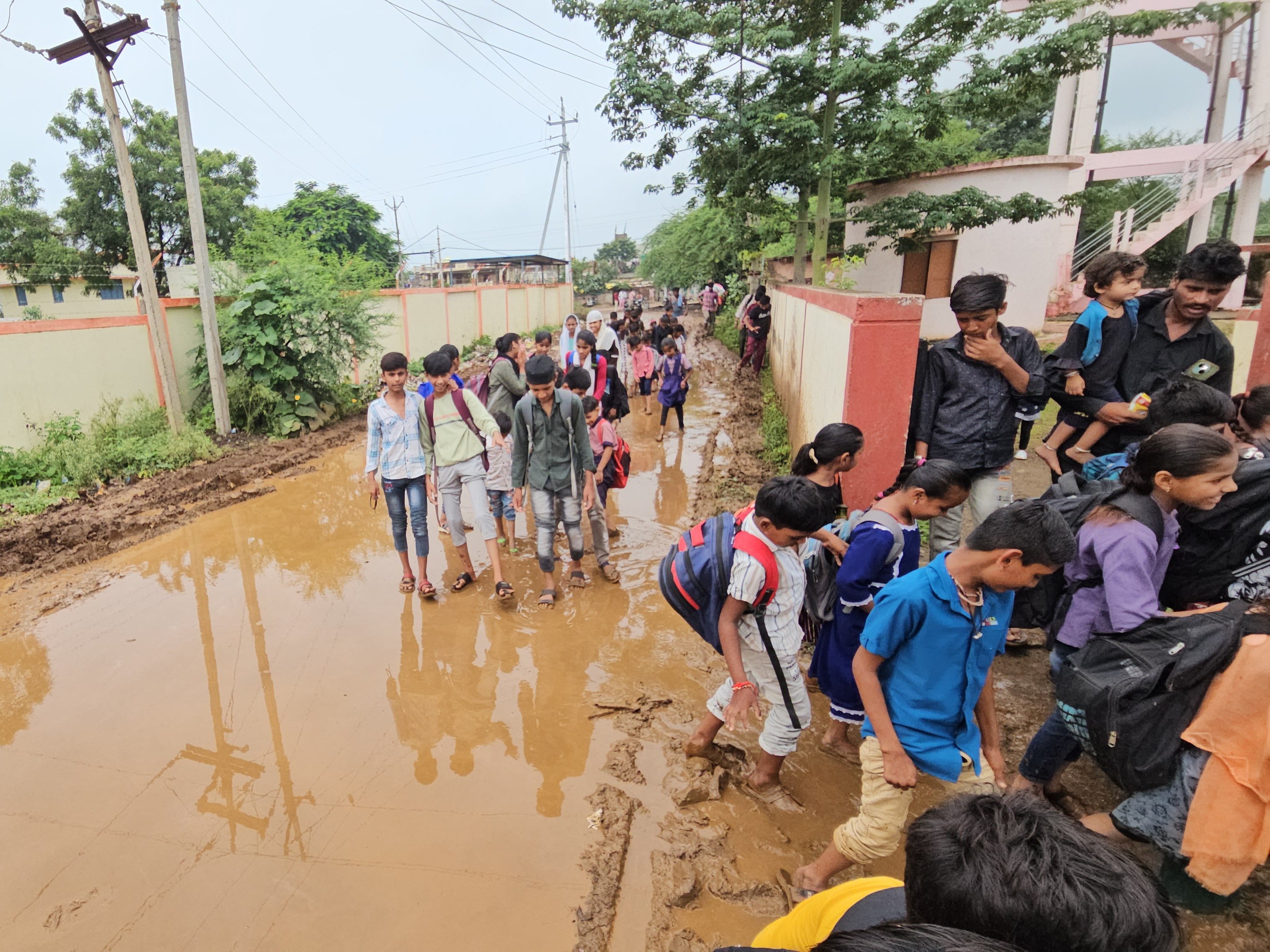 शाजापुर जिला मुख्यालय से 5 किलोमीटर दूर सांपखेड़ा में स्थित शासकीय नवीन माध्यमिक विद्यालय में गुरुवार को छात्रों को भारी परेशानी का सामना करना पड़ रहा है। कक्षा 1 से 8 तक के 149 बच्चों को स्कूल आने-जाने में कठिनाइयों का सामना करना पड़ रहा है।
