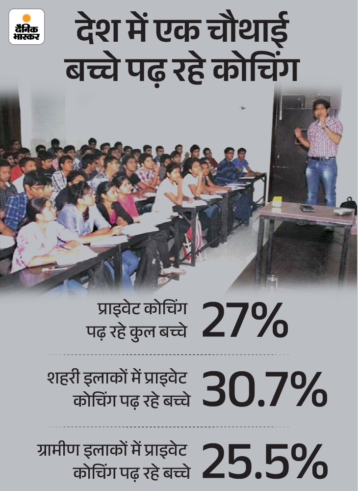 देश के एक-चौथाई स्कूली बच्चे यानी हर 4 में से 1 बच्चा स्कूल के अलावा प्राइवेट ट्यूशन ले रहा है। ये जानकारी सामने आई है केंद्र सरकार के कॉम्प्रिहेंसिव मॉड्यूलर सर्वे यानी CMS रिपोर्ट में।