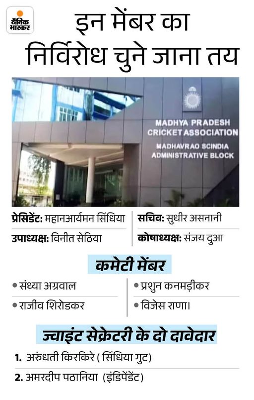 प्रेसिडेंट पद के लिए किसी ने नामांकन नहीं भरा एमपीसीए चुनाव के लिए शनिवार यानी 30 अगस्त को नामांकन की अंतिम तिथि थी, लेकिन महानआर्यमन के अलावा प्रेसिडेंट पद के लिए अन्य किसी ने भी नामांकन नहीं भरा है। ऐसे में उनका निर्विरोध चुना जाना तय है। महानआर्यमन एमपीसीए के सबसे युवा अध्यक्ष होंगे। चुनाव अधिकारी 31अगस्त यानी आज नामांकन फॉर्म की स्क्रूटनी कर नाम प्रकाशन करेंगे।