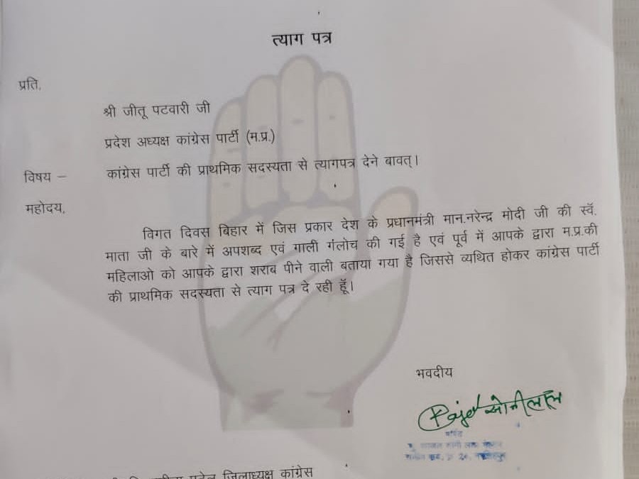 प्रधानमंत्री नरेंद्र मोदी की मां पर की गई अभद्र टिप्पणी के विरोध में कांग्रेस नेत्री और नरसिंहपुर नगर पालिका की पार्षद काजल सोनेलाल ने कांग्रेस पार्टी से इस्तीफा दे दिया है। उन्होंने भाजपा का दामन थाम लिया है।