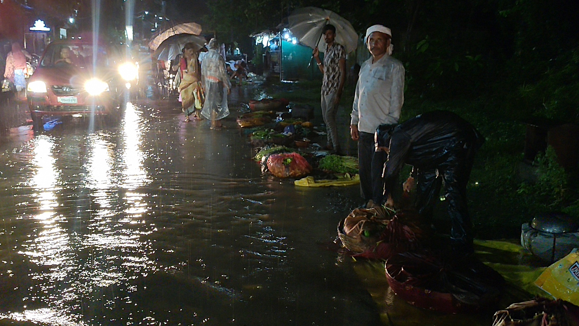 सड़क किनारे लगी दुकानों की सब्जियां भीग गई है।