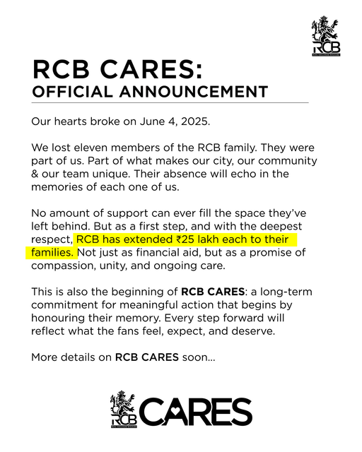 RCB की फ्रेंचाइजी ने 2 दिन पहले शनिवार 30 अगस्त को मृतकों के परिवार वालों के लिए 25-25 लाख रुपए की सहायता राशि का ऐलान करते हुए RCB Cares नाम की पहल की शुरुआत की थी और फैंस के लिए आर्थिक सहायता से ज्यादा करने का वादा किया था।