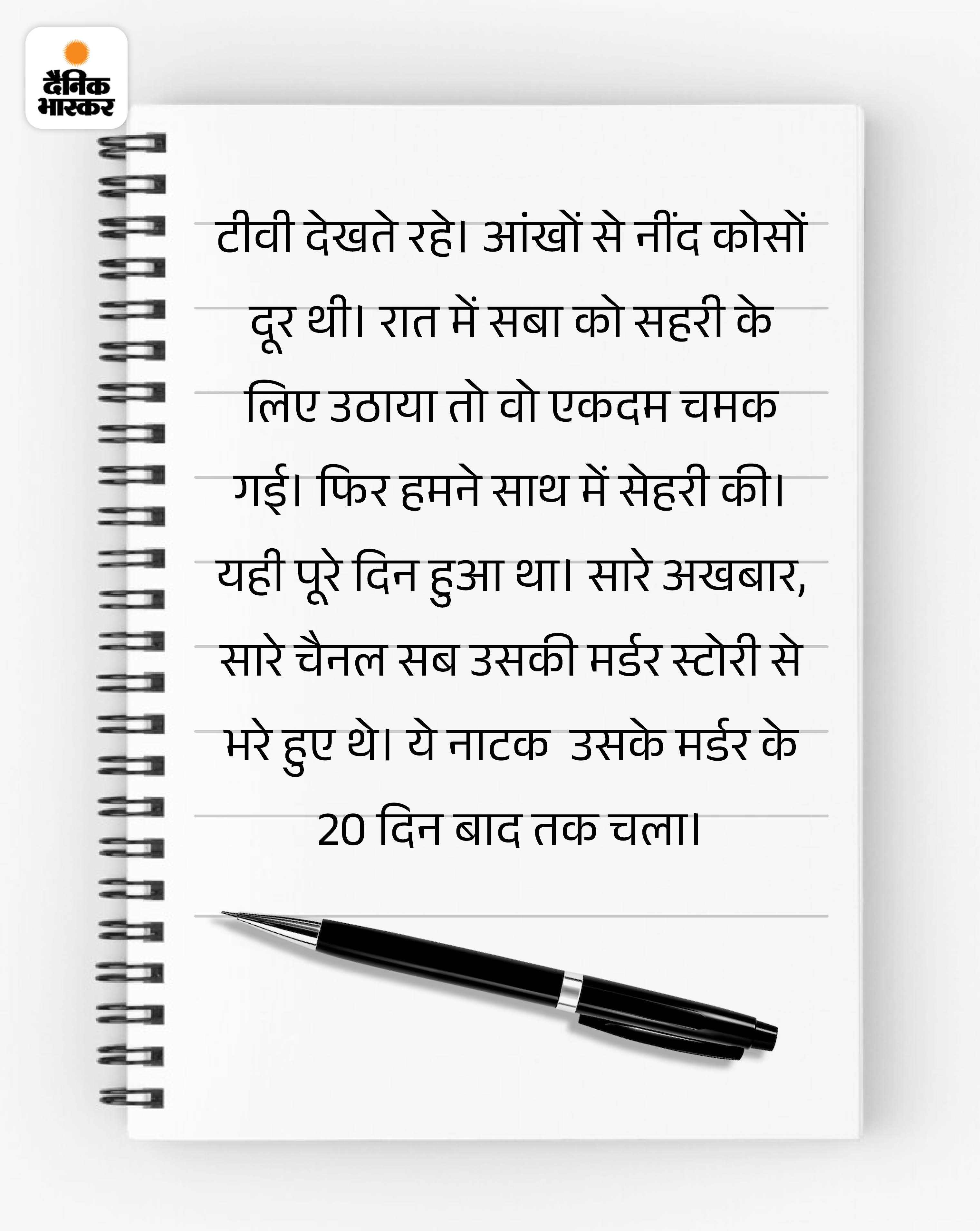 इस दौरान मेरे मोबाइल पर कई कॉल आए। केवल इस घटना की जानकारी के लिए। 12.30 बजे संजय ने भी फोन किया था, लेकिन फोन मिस हो गया था। फिर मैंने उसे वापस फोन किया तो उसने कहा कि हद है यार। नफरत की इंतेहा है ये। हमने शाम में रबाब का जन्मदिन मनाया। दो-दो केक काटे। पर हम दोनों डर रहे थे। रात में सबा चली गई थी,पर मैंने उसको फिर वापस बुला लिया। हम लोग रात भर जागते रहे।