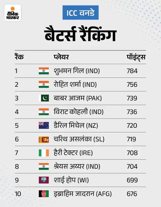 टीम रैंकिंग की बात की जाए तो भारत वनडे और टी-20 में पहले नंबर पर है। वहीं ऑस्ट्रेलिया टेस्ट में नंबर-1 पर है। बैटर्स की वनडे, टेस्ट और टी-20 के टॉप-10 रैंकिंग में कोई बदलाव नहीं हुआ है। बॉलर्स की टेस्ट रैंकिंग में न्यूजीलैंड के मैट हेनरी नंबर-3 पर आ गए हैं। वहीं जसप्रीत बुमराह पहले नंबर पर बने हुए हैं। टी-20 बॉलर्स रैंकिंग में कोई बदलाव नहीं हुआ है।