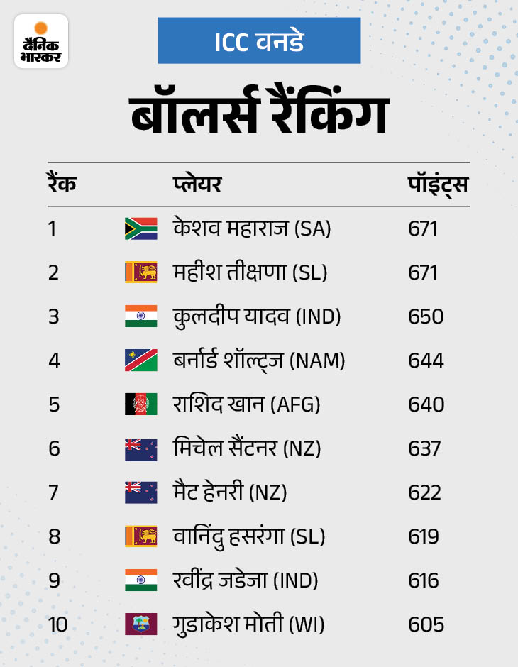 साउथ अफ्रीका के स्पिनर केशव महाराज नंबर-1 वनडे गेंदबाज हैं। उन्होंने इंग्लैंड के खिलाफ पहले वनडे में चार विकेट लेने के बाद 31 रेटिंग अंकों की बढ़त कुल 690 अंक बना ली। भारत के शुभमन गिल नंबर-1 वनडे बल्लेबाज हैं। उनके 784 अंक हैं।