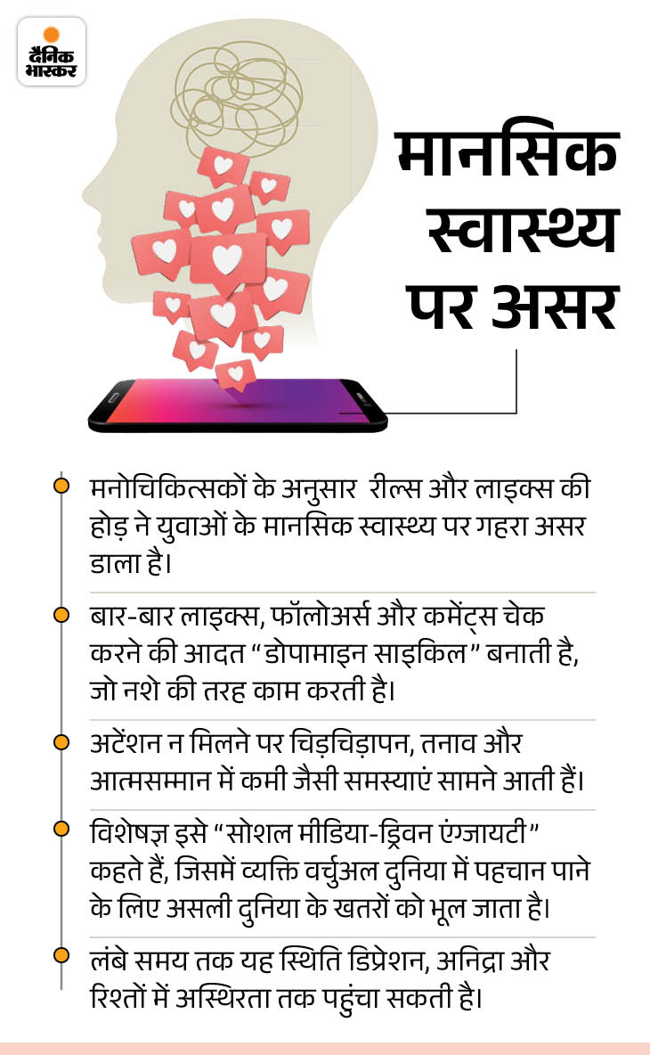 मानसिक स्वास्थ्य पर असर मनोचिकित्सकों के अनुसार रील्स और लाइक्स की होड़ ने युवाओं के मानसिक स्वास्थ्य पर गहरा असर डाला है।