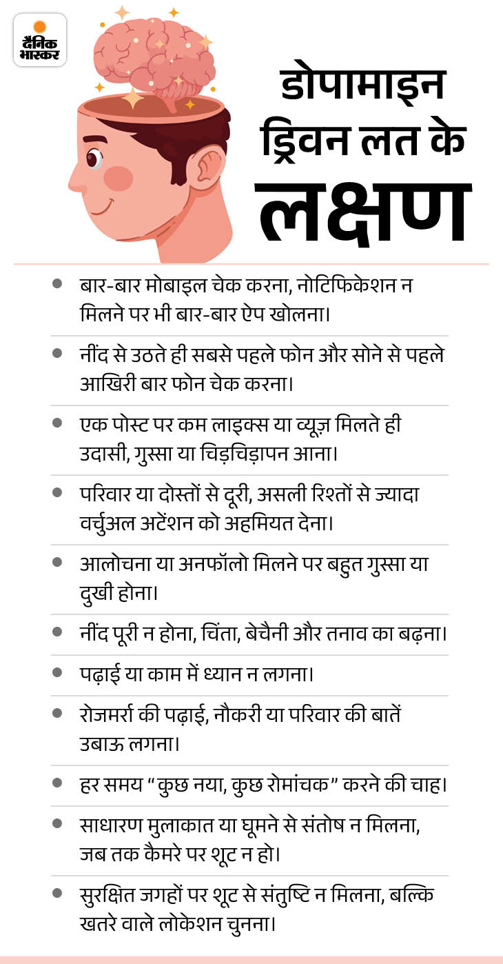 डोपामाइन देता है खुशी का एहसास बंसल हॉस्पिटल के मनोचिकित्सक डॉ. सत्यकांत त्रिवेदी का कहना है कि आजकल नेता, खिलाड़ी से लेकर सेलिब्रिटी तक सब रील्स बना रहे हैं। ऐसे में ये आजकल सामान्य व्यवहार बन गया है। कोई कम बना रहा है कोई अधिक बना रहा। इसमें सबसे इंपॉर्टेंट बात यह है कि यह हमें डोपामीन, किक देता है, इसकी वजह से फील गुड फैक्टर आता है।