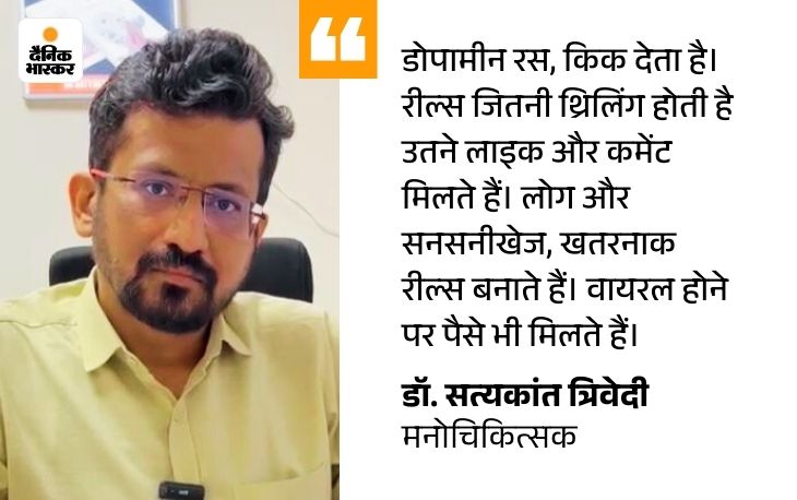 क्या कहते हैं एक्सपर्ट इस तरह रील के लिए बार-बार जान को खतरे में डालने के पीछे न सिर्फ वायरल होने का जुनून होता है, बल्कि इसके पीछे मनोविज्ञान काम करता है, जो ऐसा करने के लिए बार-बार मजबूर करता है। भास्कर ने इसके पीछे छिपे मनोविज्ञान को समझने के लिए चार मनोचिकित्सकों के एक्सपर्ट पैनल से बात की।