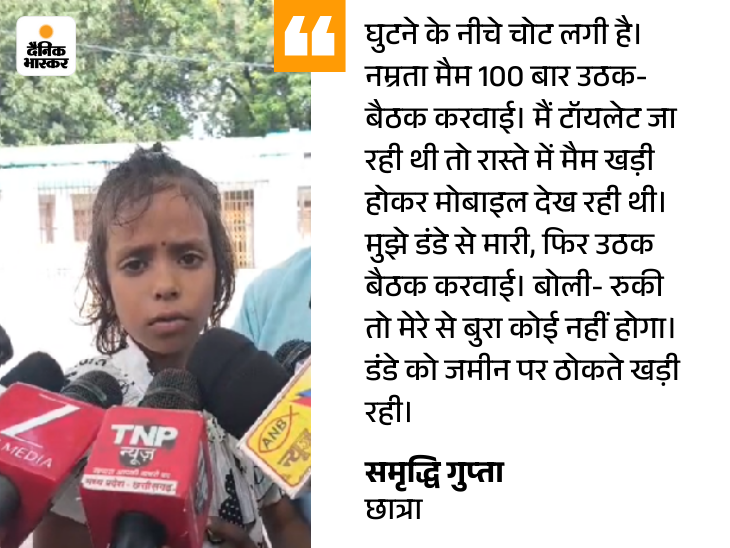 छत्तीसगढ़ के सरगुजा जिले के प्रतापगढ़ में डीएवी पब्लिक स्कूल की दूसरी क्लास की छात्रा को महिला टीचर ने 100 बार उठक-बैठक कराई। दो डंडे भी मारे। अब बच्ची पैरों पर खड़े होने और चलने की हालत में नहीं है। पैरों के मसल्स क्रैक हो गए हैं। मामला सीतापुर ब्लॉक