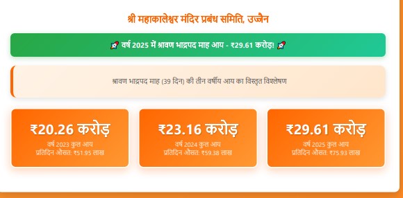 इस साल सावन-भादौ 2025 में उज्जैन के महाकाल मंदिर में लाखों भक्तों ने दर्शन किए और करोड़ों रुपए का दान दिया। मंदिर समिति ने बताया कि इस बार भक्तों की संख्या और दान दोनों ने पिछले कई सालों के रिकॉर्ड तोड़ दिए हैं।