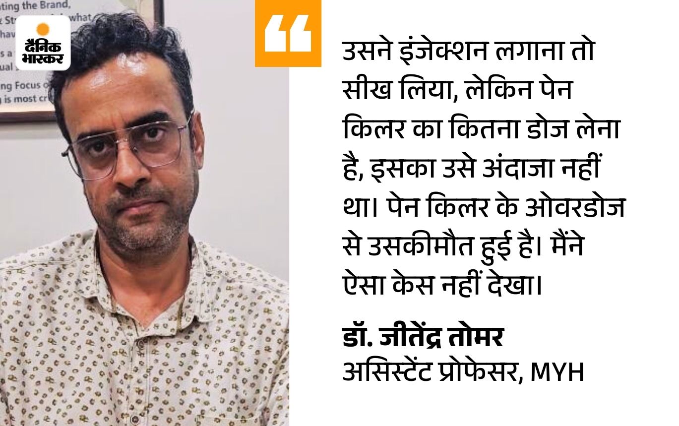 अब जानिए डॉक्टरों को नशे के बारे में कैसे पता चला युवक का पोस्टमॉर्टम करने वाले डॉक्टर और असिस्टेंट प्रोफेसर जीतेंद्र तोमर बताते हैं कि पहली बार उसकी बॉडी को देखकर ये समझ नहीं आया कि उसकी मौत कैसे हुई है। हमने उसके शरीर के सारे बॉडी पार्ट्स की इंटरनल जांच की उसके बाद भी मौत की वजह पता नहीं चली। जब उसके शरीर की बारीकी से जांच की तो पाया कि जांघों के बीच में सुई के निशान है।