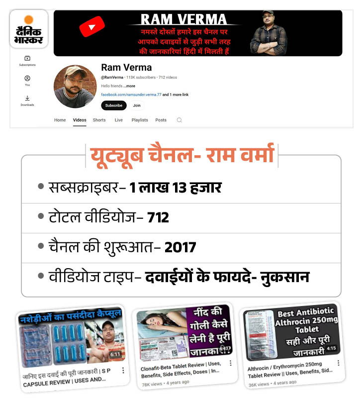 चैनल1: थंबनेल पर लिखा-नशेड़ियों का पसंदीदा कैप्सूल राम वर्मा का एक यूट्यूब चैनल है। इस चैनल को चलाने वाले राम वर्मा ने अपने ही नाम पर बनाया है। इसके बायो में लिखा है कि इस चैनल पर आपको दवाइयों से जुड़ी सारी जानकारी दी जाएगी। चैनल पर अबतक 700 से ज्यादा वीडियो अपलोड हैं। एक वीडियो है जिसके थंबनेल पर लिखा है कि नशेड़ियों का पसंदीदा कैप्सूल।