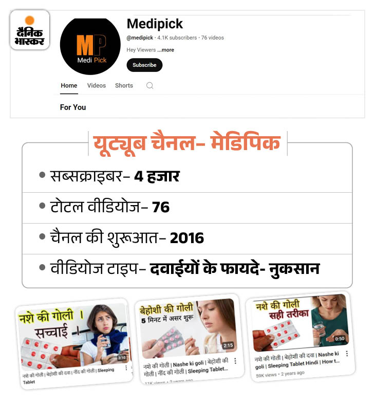 चैनल 2: थंबनेल पर लिखा- नशे की गोली, सही तरीका इस चैनल का नाम है मेडिपिक। चैनल पर 76 वीडियो अपलोड हैं। सबसे ज्यादा पॉपुलर वीडियोज के टाइटल नशे से ही जुड़े हैं। एक वीडियो का टाइटल है- नशे की गोली, बेहोशी की दवा, नींद की गोली। दूसरा टाइटल है- नशे की गोली, सही तरीका और तीसरे वीडियो के थंबनेल पर लिखा है- बेहोशी की गोली, 5 मिनट में असर शुरू। इन सभी वीडियोज में नींद की गोली की बात की जा रही है।