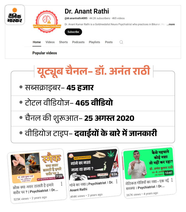 ये चैनल डॉ. अनंत राठी का है। डॉक्टर राठी दवाओं के बारे में जानकारी देते हैं। एक वीडियो जानकारी दे रहे हैं कि कैसे पहचाने कि कोई मेडिकल दवाओं का नशा तो नहीं कर रहा। इस वीडियो में वो दवाओं के बारे में बताते हैं। ये भी बताते हैं कि कितनी मात्रा में लेने पर किस दवा का नशा होता है। उन्हें लगता है कि वो नशे के खिलाफ लोगों को अवेयर कर रहे हैं।