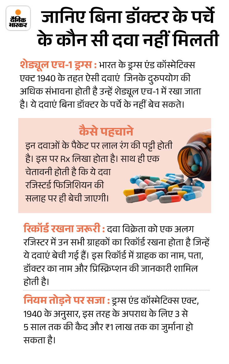 मेडिकल संचालक ने बिना डॉक्टर का पर्चा देखे या मांगें 4 टैबलेट दे दी। इन टेबलेट्स पर रेड स्ट्रीप बनी है जिस पर साफ लिखा था कि ये शेड्यूल एच 1 टाइप ड्रग है। जिसे बिना डॉक्टर के प्रिस्क्रिप्शन के नहीं दे सकते।