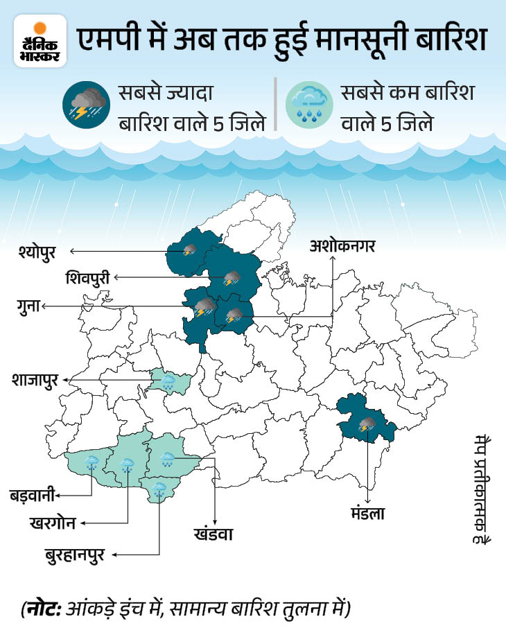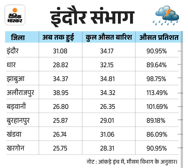 दूसरी ओर, बुरहानपुर में 26 इंच भी पानी नहीं गिरा है। धार, बड़वानी, खंडवा, शाजापुर और खरगोन में अब तक 30 इंच पानी भी नहीं गिरा। हालांकि, औसत बारिश के हिसाब से बड़वानी का कोटा भी पूरा हो चुका है। मौसम विभाग के अनुसार, सितंबर में अभी करीब 22 दिन बारिश होगी। ऐसे में इन जिलों में भी मानसून की तस्वीर बेहतर हो सकती है।