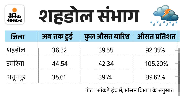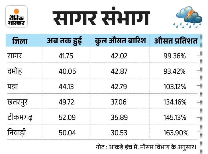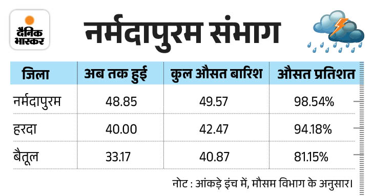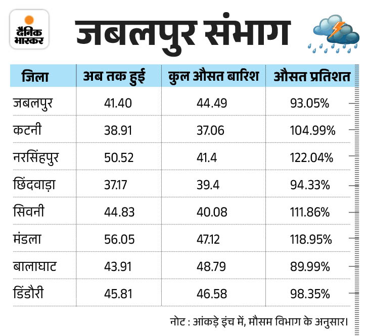 - 8 में से 6 जिलों में कोटा पूरा हो गया। जबलपुर-छिंदवाड़ा ही 7 से 8 प्रतिशत बाकी है। मंडला में सबसे ज्यादा 56 इंच पानी गिरा है।