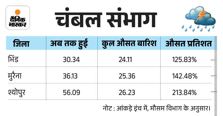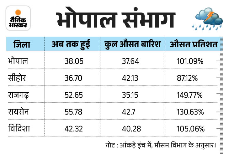 मौसम विभाग के अनुसार 30 जिले-भोपाल, राजगढ़, रायसेन, विदिशा, अलीराजपुर, बड़वानी, कटनी, नरसिंहपुर, सिवनी, मंडला, ग्वालियर, शिवपुरी, गुना, अशोकनगर, दतिया, पन्ना, छतरपुर, टीकमगढ़, निवाड़ी, रतलाम, मंदसौर, नीमच, आगर-मालवा, भिंड, मुरैना, श्योपुर, सिंगरौली, सीधी, सतना और उमरिया में बारिश का कोटा फुल हो चुका है। कई जिले ऐसे हैं, जहां आंकड़ा डेढ़ सौ प्रतिशत के पार है। श्योपुर में कुल 213 प्रतिशत पानी गिर चुका है।