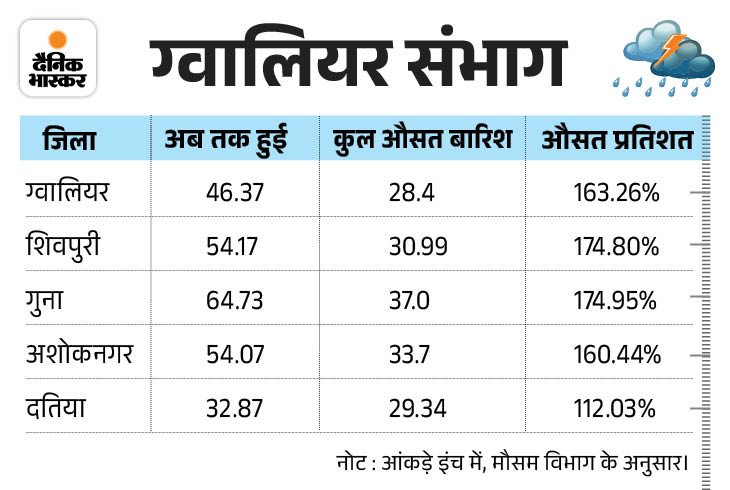 - ग्वालियर: ग्वालियर संभाग में अच्छी बारिश हुई है। 5 जिलों में सीजन की बारिश का कोटा पूरा हो गया है। शिवपुरी-गुना में सामान्य से 74 प्रतिशत बारिश ज्यादा हुई है। गुना में ओवरऑल सबसे ज्यादा करीब 65 इंच पानी गिर चुका है।