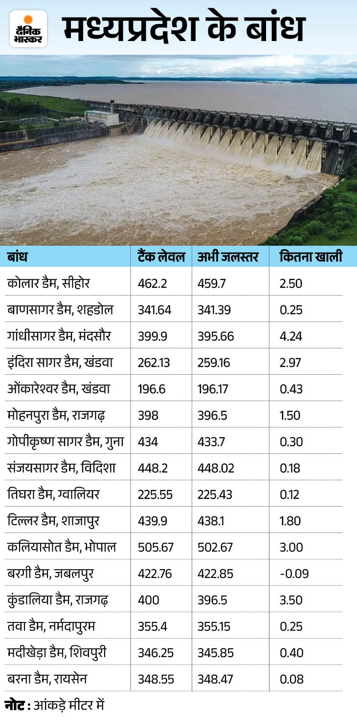 ऐसे में डैम के गेट नहीं खुल सके, लेकिन अगस्त के आखिरी और सितंबर के पहले सप्ताह में तेज बारिश का दौर रहा। इस वजह से भोपाल के भदभदा डैम का गेट भी खुल गया। इस बार जौहिला, बरगी, इंदिरासागर, बारना, अटल सागर, सुजारा, सतपुड़ा, तवा समेत कई डैम के गेट खुल चुके हैं। कुल 54 बड़े डैमों में अच्छा पानी आ चुका है।