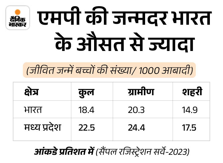 गांवों में अधिक पैदा हो रहे बच्चे एक हजार की जनसंख्या पर एक साल में पैदा हुए जीवित बच्चों की संख्या को क्रूड बर्थ रेट कहा जाता है। 2023 के आंकड़ों के अनुसार मध्य प्रदेश में क्रूड बर्थ रेट 22.5 फीसदी है जो देश के औसत 18.4 फीसदी से काफी अधिक है। इसका मतलब प्रदेश की जनसंख्या देश की अपेक्षा तेजी बढ़ रही है।