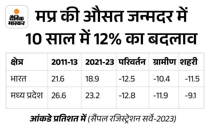 रिपोर्ट के मुताबिक पिछले 10 सालों में मध्य प्रदेश में जन्मदर में 12.8 फीसदी की कमी आई है, लेकिन अभी भी ग्रामीण इलाकों में बच्चों के पैदा होने की दर शहरी क्षेत्र से ज्यादा है। वहीं मप्र की आबादी देश की औसत आबादी की तुलना में तेजी से बढ़ रही है। पढ़िए रिपोर्ट