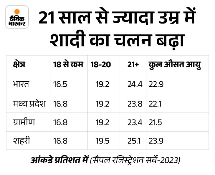 ग्रामीण क्षेत्रों में औसत विवाह आयु 21.5 साल है, जबकि शहरी क्षेत्रों में यह 23.9 साल है। मप्र में 62.5 फीसदी लड़कियों की शादी 21 साल से ज्यादा उम्र होने के बाद हुई है। हालांकि ग्रामीण और शहरी इलाकों में इसमें काफी अंतर है। ग्रामीण इलाकों में 21 साल से ज्यादा उम्र की लड़कियों की शादी का प्रतिशत 57.5% और शहरी में ये 80.2% है।