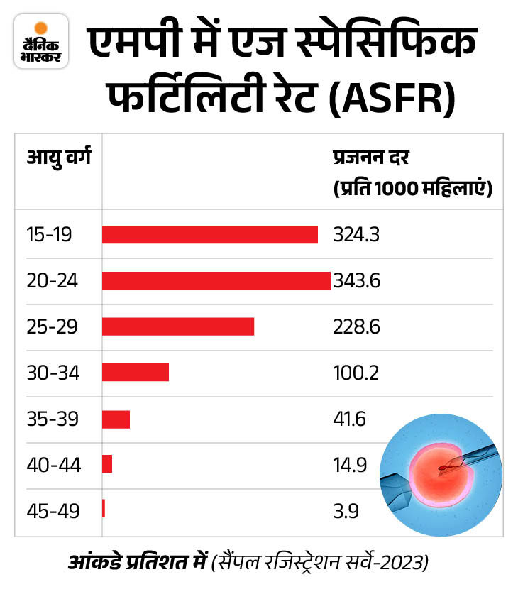कम उम्र में मां बनने की प्रवृत्ति अभी भी ज्यादा 2023 के आंकड़ों के अनुसार, 20-24 वर्ष की आयु वर्ग में महिलाओं की प्रजनन क्षमता सबसे अधिक है। मध्य प्रदेश में 20-24 वर्ष की आयु वर्ग में प्रजनन दर सबसे अधिक एक हजार में महिलाओं में 343.6 रही। 15-19 वर्ष की आयु में यह 324.3 दर्ज हुई, जो बताता है कि कम उम्र में मां बनने की प्रवृत्ति राज्य में अभी भी अधिक है।