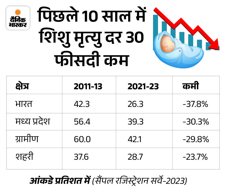2021-23 के आंकड़ों के अनुसार, मध्य प्रदेश में शिशु मृत्यु दर (IMR) में 30.3% की कमी आई है। यह 2011-13 के 56.4 से घटकर 2021-23 में 39.3 पर पहुंचा है, लेकिन राष्ट्रीय औसत 26.3 की तुलना में यह अभी भी चिंताजनक है। ग्रामीण क्षेत्रों में 29.8% कमी दर्ज की गई, जो 60.0 से घटकर 42.1 है। शहरी क्षेत्रों में 37.6 से घटकर 28.7 फीसदी शिशु मृत्यु दर दर्ज की गई है।