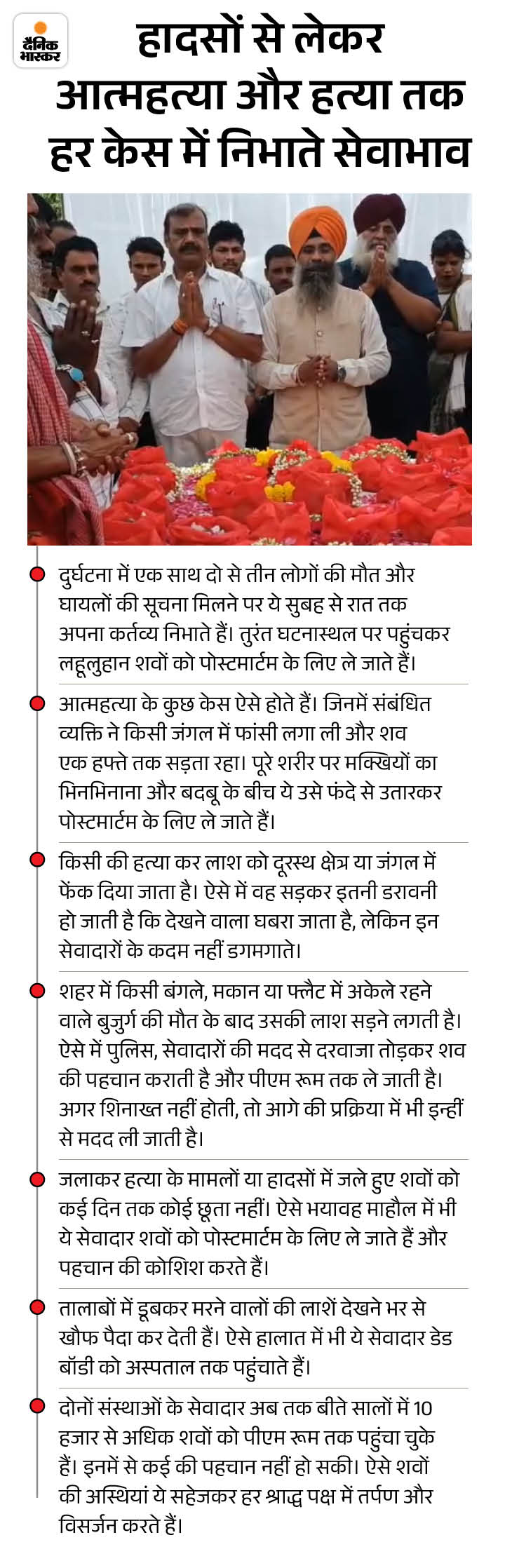 दोनों संस्थाएं 10 हजार से अधिक लावारिस शवों का अंतिम संस्कार कर चुकी हैं। इनमें से 8 हजार शव वे हैं, जिनका अंतिम संस्कार पुलिस या अस्पताल से सूचना मिलने के बाद किया गया। 2 हजार से अधिक शव वे हैं। जिन्हें विभिन्न प्रकार के हादसों (डरावने) से रेस्क्यू कर पोस्टमार्टम के लिए अस्पताल लाया गया।