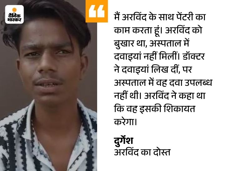 वीडियो में अरविंद ने कहा- अस्पताल में स्टॉक खत्म हो गया है अरविंद की मौत के बाद उसका एक वीडियो सामने आया है। यह मौत के पहले बनाया गया था। वीडियो में दिख रहा है, युवक हाथ में अस्पताल से डॉक्टर का लिखा पर्चा लेकर अस्पताल से बाहर जाता है। क्योंकि अस्पताल में पर्चे पर लिखी दवा उपलब्ध नहीं थी। इसके बाद उसने मोबाइल में वीडियो चालू करके अपनी दवा लेने की प्रक्रिया रिकॉर्ड की।