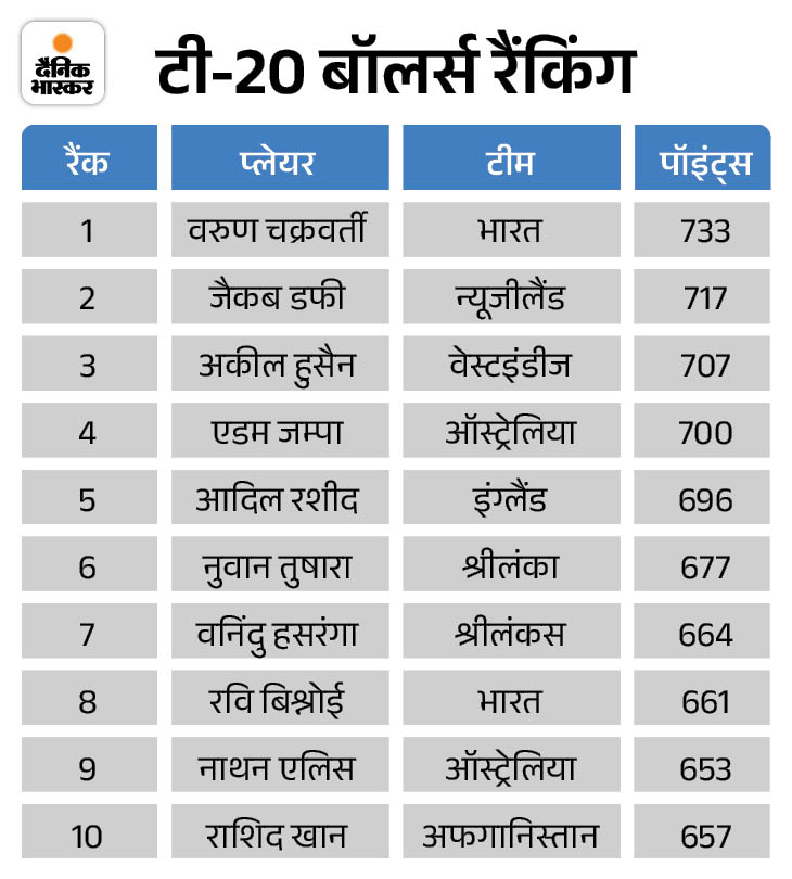 वरुण चक्रवर्ती ने न्यूजीलैंड के तेज गेंदबाज जैकब डफी को पीछे छोड़ा।