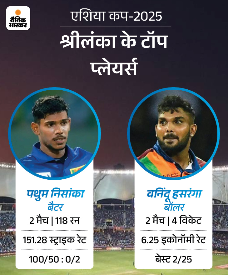 निसांका ने शुरुआती दोनों मैचों में अर्धशतक लगाए श्रीलंका के पथुम निसांका 118 रन के साथ एशिया कप 2025 के टॉप बैटर हैं। निसांका ने टूर्नामेंट के दोनों ही मैचों में अर्धशतक लगाया है। उन्होंने पहले मैच में बांग्लादेश के खिलाफ 50 और दूसरे मैच में हॉन्ग कॉन्ग के खिलाफ 68 रन की पारी खेली थी। वनिंदू हसरंगा टीम के लिए सबसे ज्यादा विकेट लिए हैं।