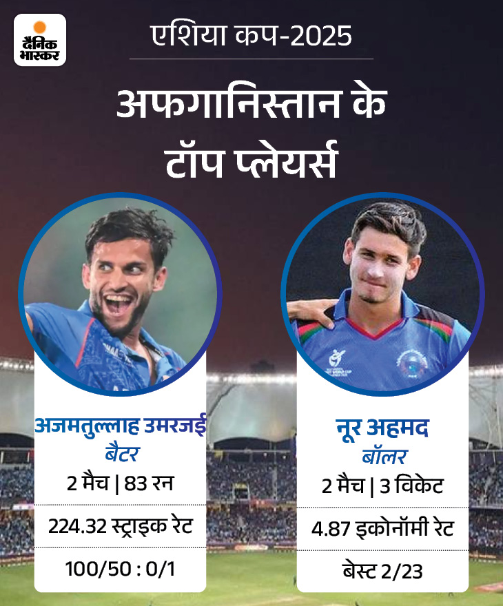 उमरजई ने टीम के लिए सबसे ज्यादा रन बनाए टूर्नामेंट के पहले मैच में हॉन्ग कॉन्ग के खिलाफ अफगानिस्तान ने 94 रन की बड़ी जीत दर्ज की। सेदिकुल्लाह अटल ने शानदार बैटिंग की, नाबाद 73 रन बनाए थे। उस मैच में अजमतुल्लाह उमरजई ने 21 गेंदों में 53 रन बनाए थे। उमरजई टूर्नामेंट में टीम के टॉप स्कोरर हैं। नूर अहमद ने सबसे ज्यादा विकेट झटके हैं।
