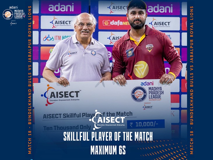 MPL 2025 में ‘AISECT Skillful Player’ सम्मान Shrimant Madhavrao Scindia क्रिकेट स्टेडियम, ग्वालियर में आयोजित इस प्रतिष्ठित टी-20 राज्य स्तरीय क्रिकेट लीग में इस बार रोमांच चरम पर रहा। आईसेक्ट समूह ने अपने ‘स्किलफुल एजुकेशन मॉडल’ को बढ़ावा देते हुए विशेष पुरस्कारों की घोषणा की: