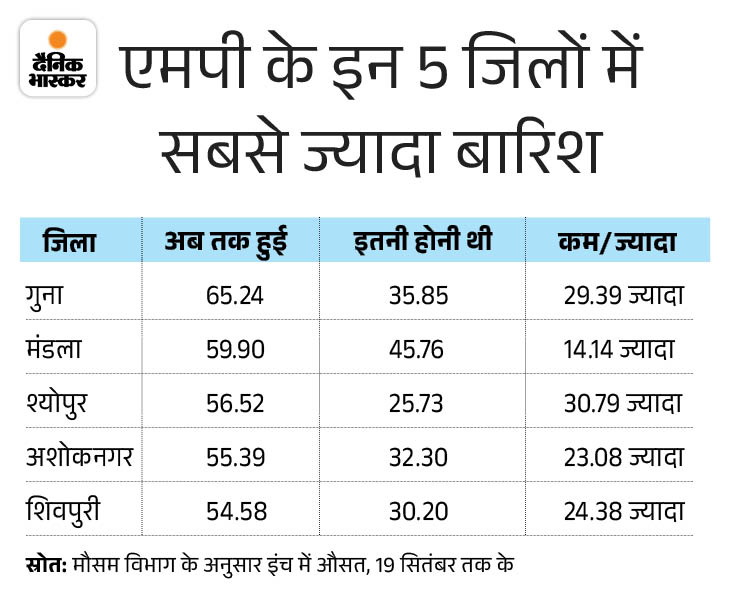 गुना में सबसे ज्यादा 65.2 इंच पानी गिर चुका है। मंडला में 59.9 इंच, श्योपुर में 56.5 इंच, अशोकनगर में 55.4 इंच और शिवपुरी में 54.6 इंच बारिश हो चुकी है। वहीं, सबसे कम 26.2 इंच बारिश खरगोन में हुई। शाजापुर में 28 इंच, खंडवा में 28.3 इंच, बड़वानी में 28.6 इंच और धार में 30 इंच पानी गिर चुका है।