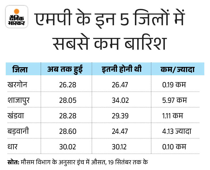 इंदौर-उज्जैन संभाग की तस्वीर बेहतर नहीं इस मानसूनी सीजन में इंदौर और उज्जैन संभाग की स्थिति ठीक नहीं है। यहां सबसे कम पानी गिरा है। सबसे कम बारिश वाले टॉप-5 जिलों में बुरहानपुर, बड़वानी, खंडवा खरगोन और शाजापुर शामिल हैं।