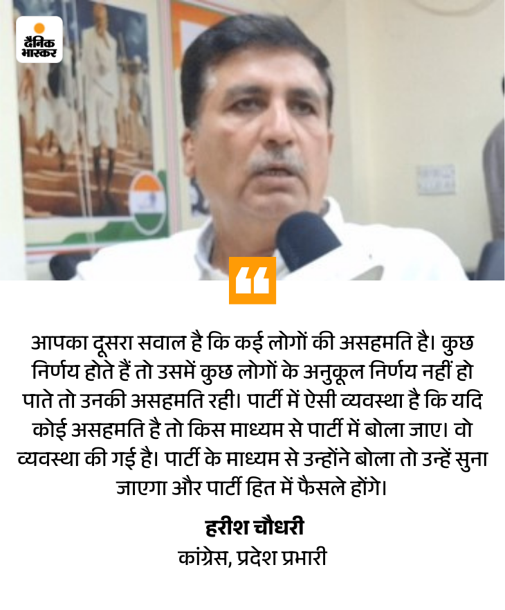 सवाल: कई लोग नाराज हैं। कमलेश्वर पटेल ने कहा कि प्रदेश प्रभारी का काम पार्टी बनाना है, पार्टी बनना नहीं? हरीश चौधरी: कमलेश्वर जी, सीडब्ल्यूसी के मेंबर हैं। उन्होंने जो सलाह दी वो सही सलाह है। हम हर स्तर पर सामंजस्य के लिए आए हैं। हमें सामंजस्य ही बनाना है।