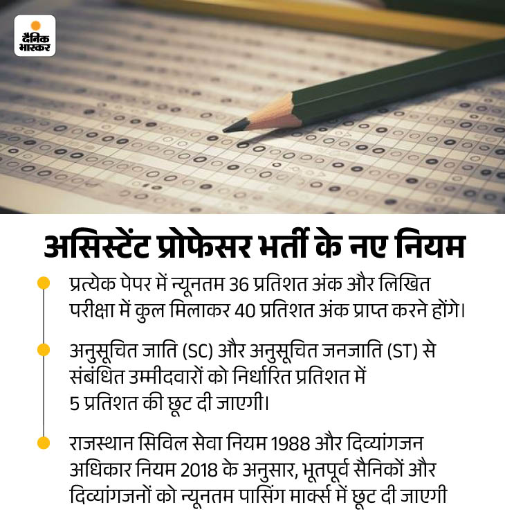 लेकिन, अब असिस्टेंट प्रोफेसर (कॉलेज एजुकेशन डिपार्टमेंट) भर्ती में ऐसा नहीं होगा, क्योंकि सेवा नियमों में बदलाव किया गया है। 16 सितंबर 2025 को जारी किए नए नियमों के अनुसार, अब जो अभ्यर्थी परीक्षा में 200 अंक (इंटरव्यू के मार्क्स हटाकर) में से 80 अंक प्राप्त नहीं करेगा, वह न केवल चयन से वंचित रहेगा, बल्कि इंटरव्यू तक भी नहीं पहुंच पाएगा।
