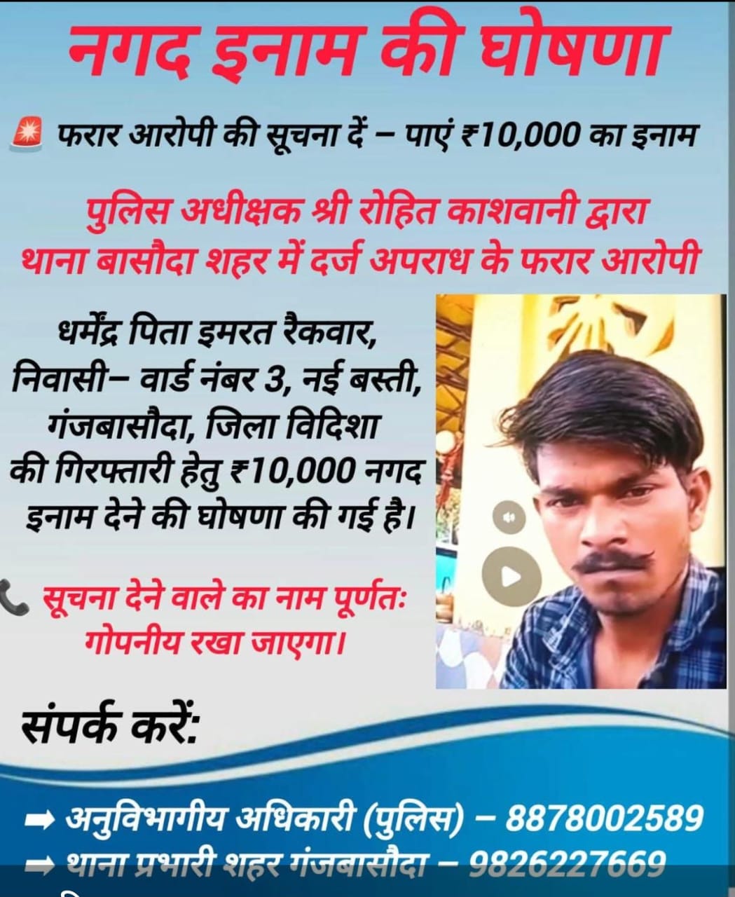 पुलिस प्रधान आरक्षक पर हमला करने वाले आरोपी की सूचना देने वाले को विदिशा पुलिस अधीक्षक रोहित कासवनी ने ₹10000 का इनाम घोषित कर दिया है। मामले की गंभीरता को देखते हुए पुलिस ने शहर के रेलवे स्टेशन, बस स्टैंड और मुख्य चौराहा पर जांच अभियान भी शुरू कर दिया है।