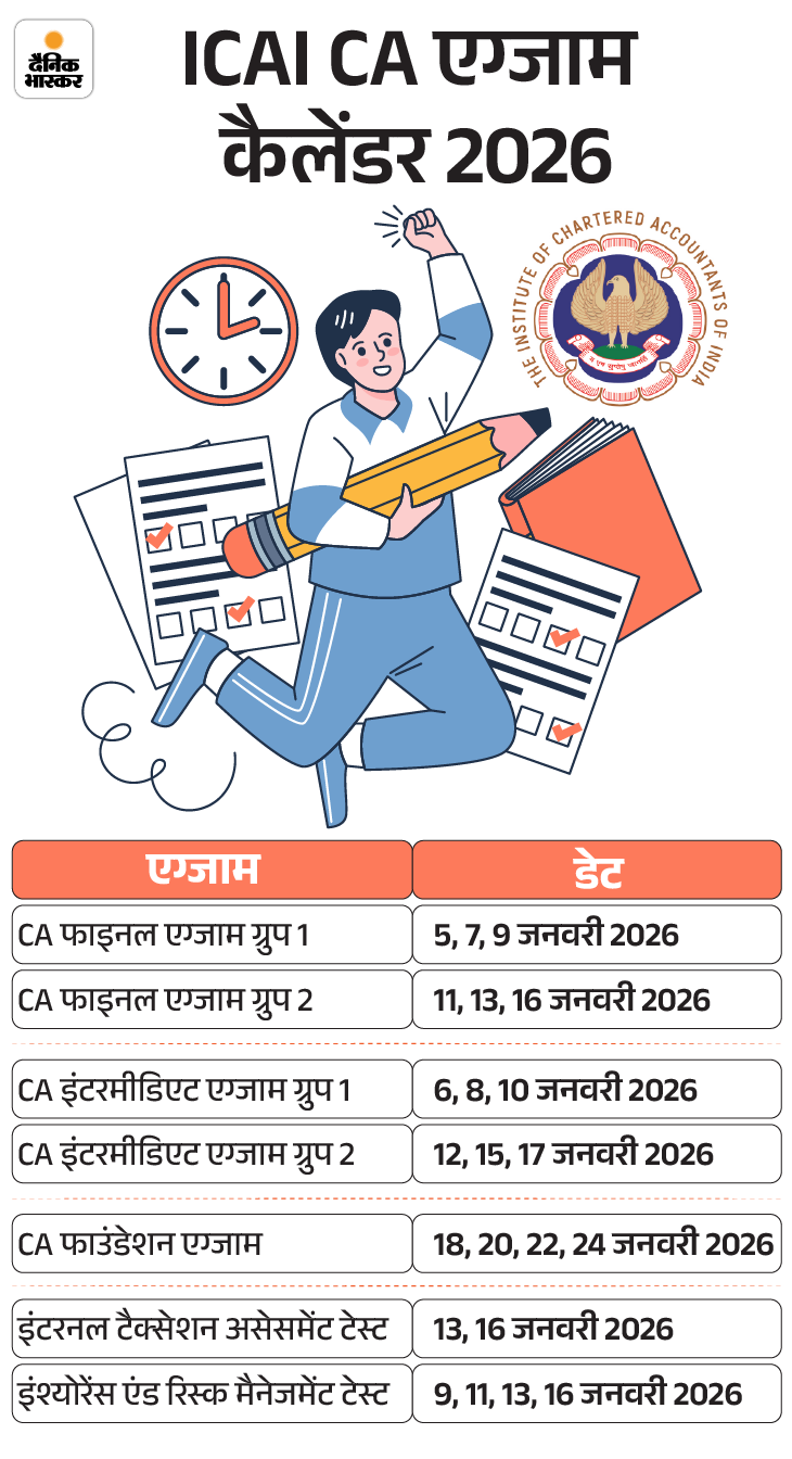 इंस्टीट्यूट ऑफ बैंकिंग पर्सनल सिलेक्शन यानी ICAI ने जनवरी 2026 में होने वाले CA एग्जाम्स की डेटशीट जारी कर दी है। जो कैंडिडेट्स एग्जाम में शामिल होने वाले हैं, वे ऑफिशियल वेबसाइट icai.org पर पूरी डेटशीट चेक कर सकते हैं।