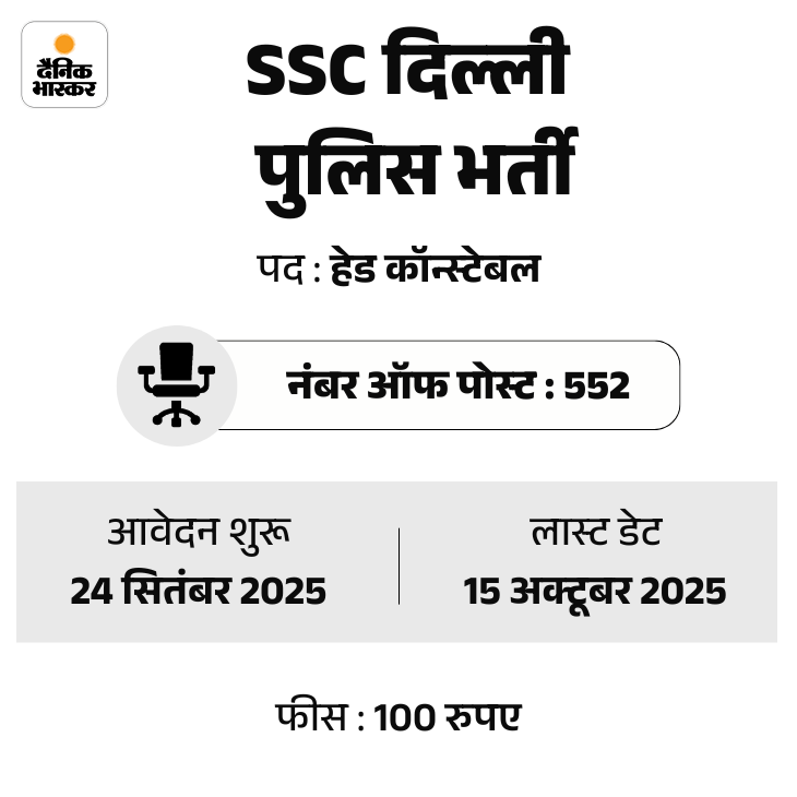 कर्मचारी चयन आयोग (SSC) ने एसएससी दिल्ली पुलिस हेड कॉन्स्टेबल भर्ती 2025 का नोटिफिकेशन जारी किया है। इस भर्ती के माध्यम से दिल्ली पुलिस में 552 पद भरे जाएंगे। उम्मीदवार ऑफिशियल वेबसाइट ssc.gov.in के माध्यम से आवेदन कर सकते हैं।