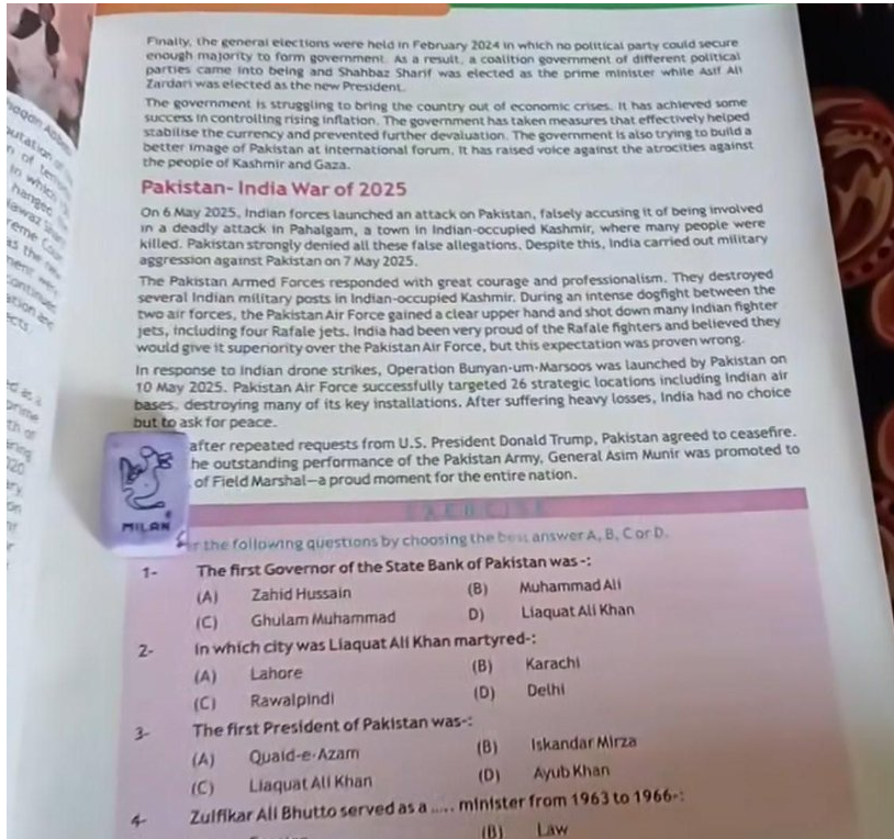 नए सिलेबस में बताया गया है कि भारत ने पहलगाम में हुए हमले का आरोप जबरन भारत पर लगाया जिसके जवाब में पाकिस्तान ने भारत को 4 दिन में ही हरा दिया।
