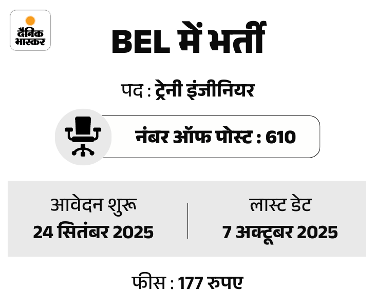 भारत इलेक्ट्रॉनिक्स लिमिटेड (BEL) में 600 से ज्यादा पदों पर भर्ती निकली है। उम्मीदवार ऑफिशियल वेबसाइट jobapply.in पर जाकर आवेदन कर सकते हैं। इस भर्ती के लिए 25 और 26 अक्टूबर को रिटन एग्जाम का आयोजन किया जाएगा।
