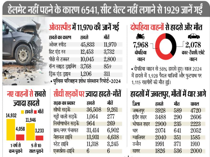 ओवर स्पीडिंग से हादसे और मौतें मप्र में ओवर स्पीडिंग के कारण 32,034 हादसे हुए। जिनमें 7,853 मौतें और 32,853 घायल हुए। ओवरस्पीडिंग के कारण इंदौर में 239, जबलपुर में 97, ग्वालियर में 67 मौतें हुईं। भोपाल के ओवर-स्पीडिंग मामले NCRB में दर्ज नहीं।