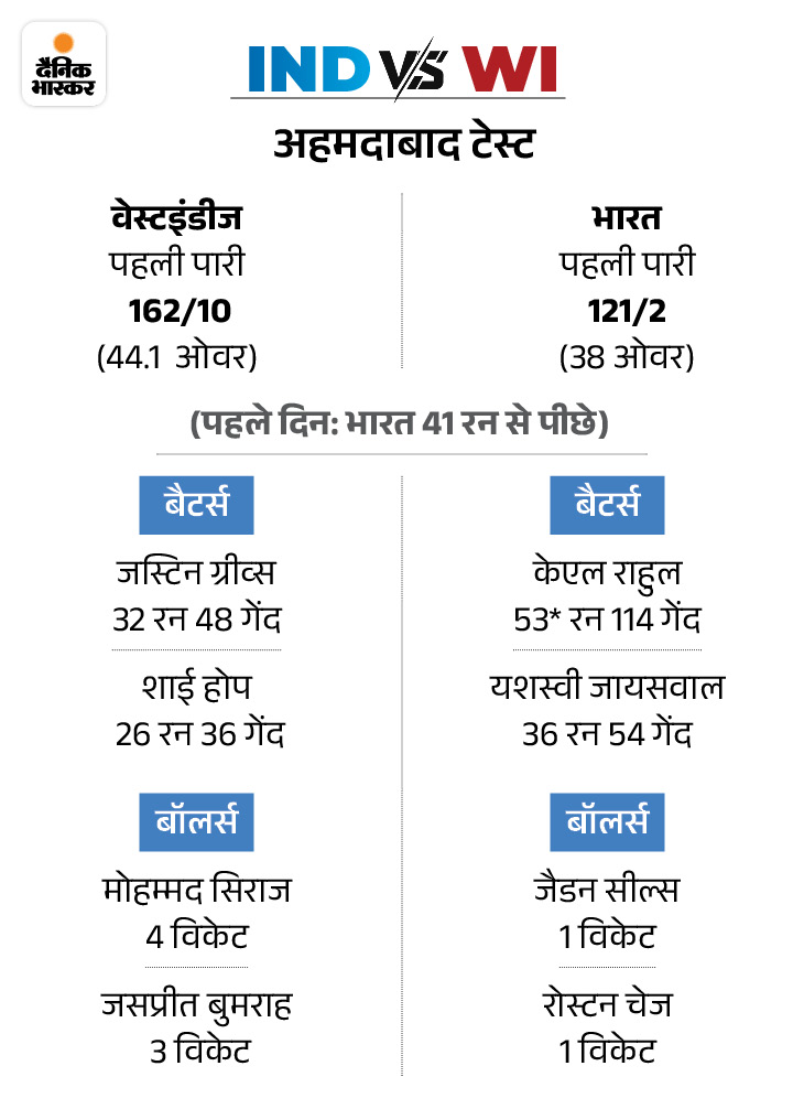 भारत और वेस्टइंडीज के बीच अहमदाबाद के नरेंद्र मोदी स्टेडियम में पहला टेस्ट खेला जा रहा है। गुरुवार को टॉस जीतकर पहले बैटिंग करने उतरी कैरेबियन टीम 162 रन ही बना सकी। भारत ने 2 विकेट खोकर 121 रन बना लिए। शुक्रवार को दूसरे दिन केएल राहुल और शुभमन गिल भारत की पारी आगे बढ़ाएंगे।